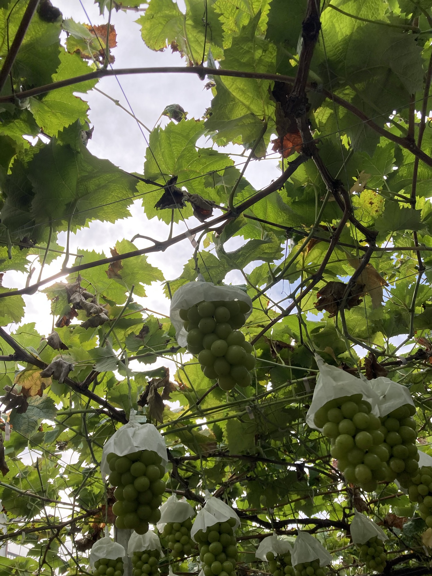 雨が降っているかのようにシャインマスカットの実がついています(^ ^)身の一つ一つが大きく、これほどの作品を作られた方!!感動しました(^ ^)